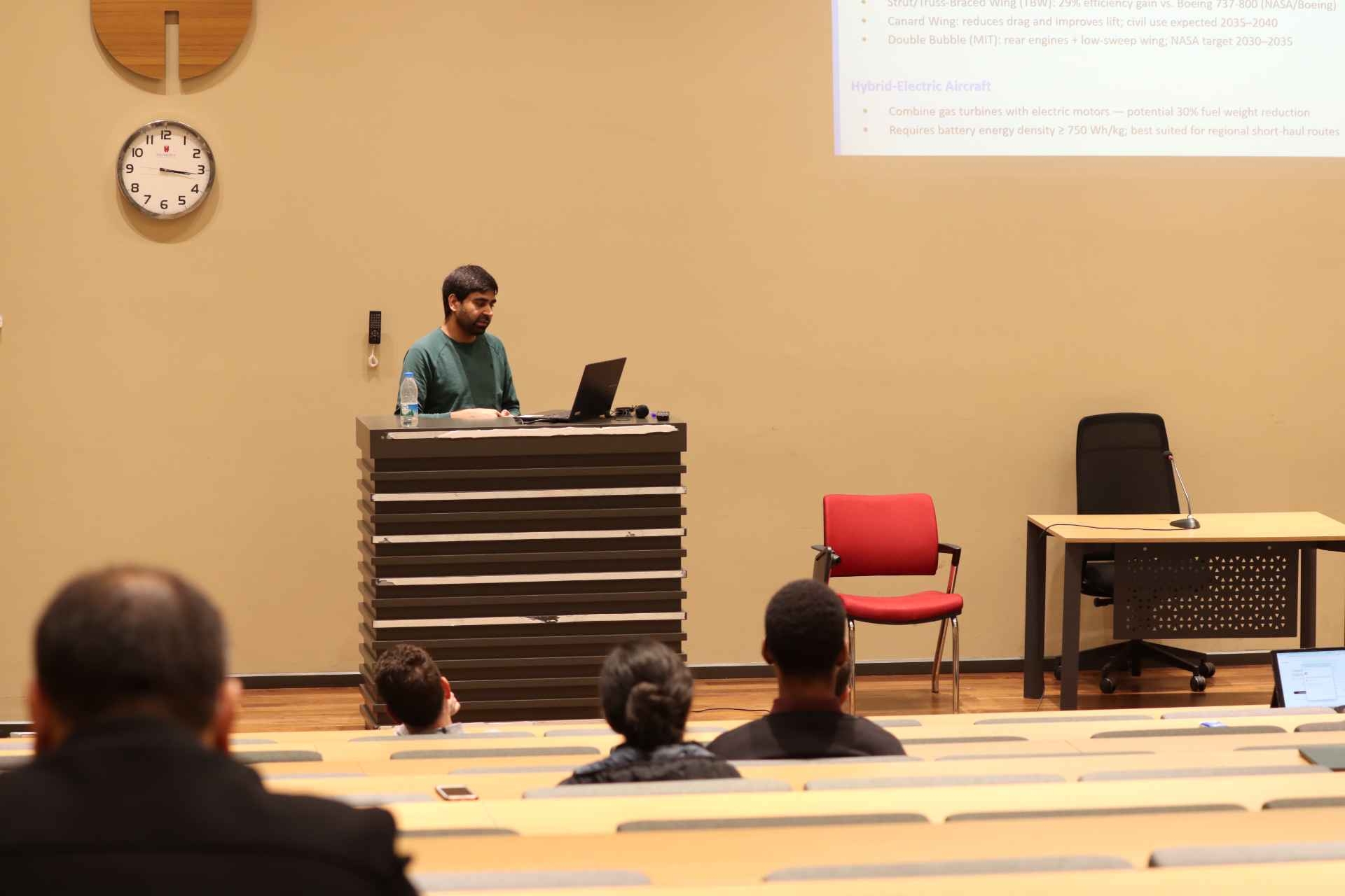 On Tuesday, March 31, 2026, our PhD candidate in Management, Umaal Ahmed Khan, gave a presentation titled “Fuel Efficiency Strategies and Technological Advancements in the Aviation Industry”.